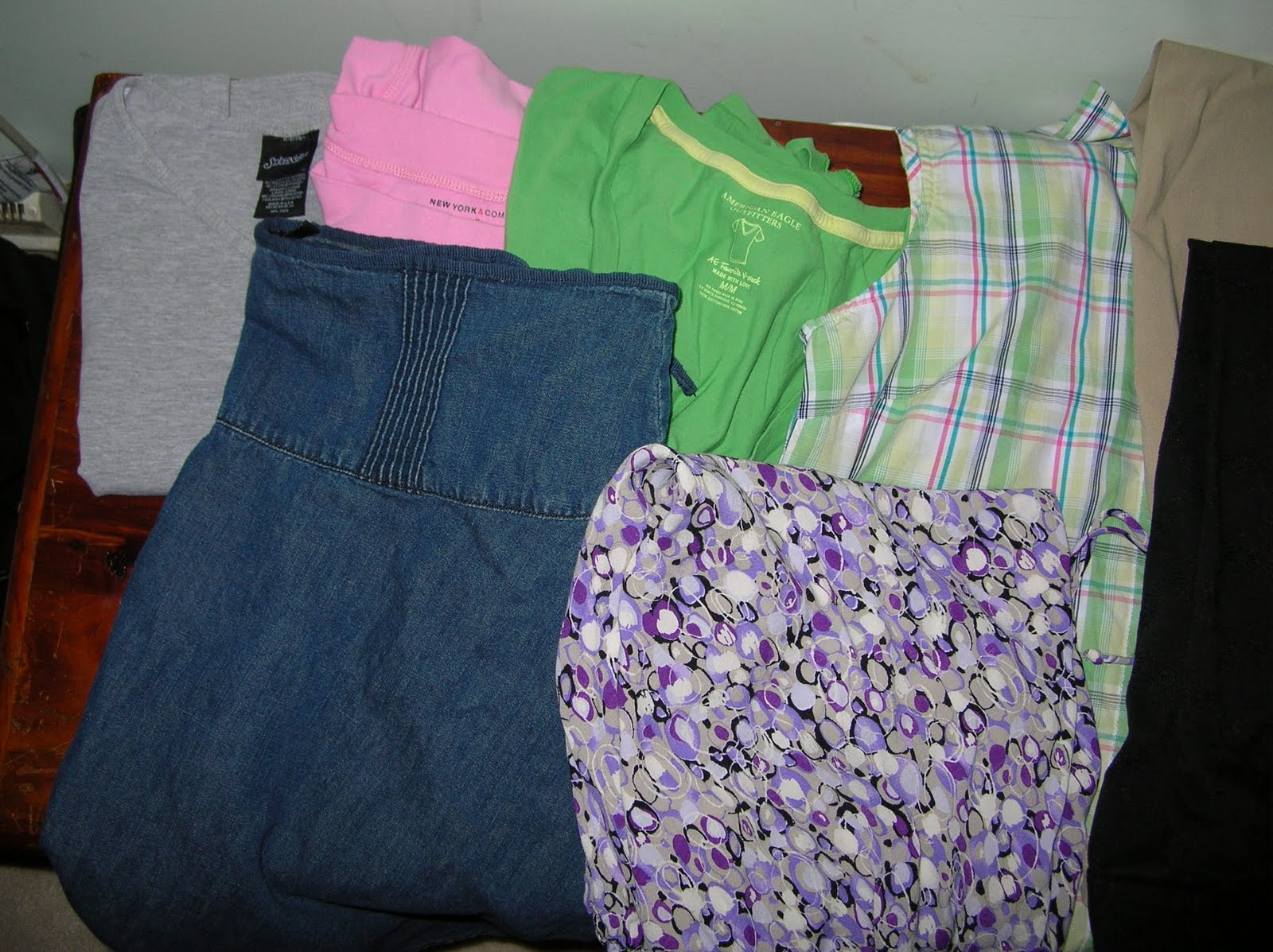 Clothes for the kids. I am stocking up on bigger sizes. The blue capris in the middle are the Gymboree ones!; Clothes for ME! I decided to give myself some motivation to get the next size down in clothing. Surprisingly most of this fits already. Oh and the denim skirt is a Calvin Klein skirt!;)